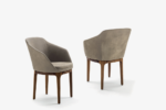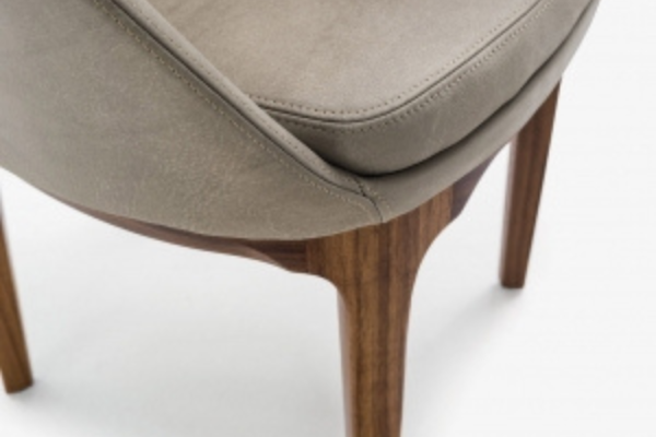 Eleganter und umhüllender Armlehnstuhl mit Struktur aus Polyurethanschaum. Der weiche Sitzpolster. Variante des ursprünglichen Stuhls, mit Holzbeinen.