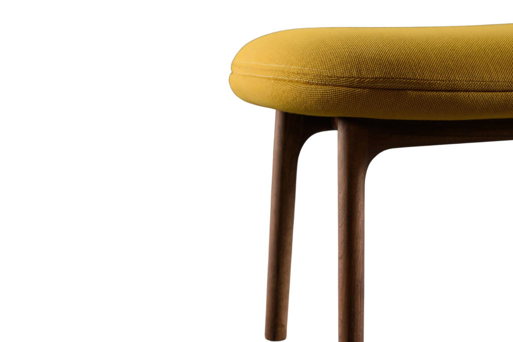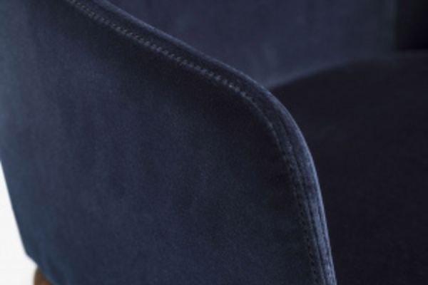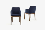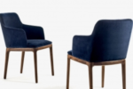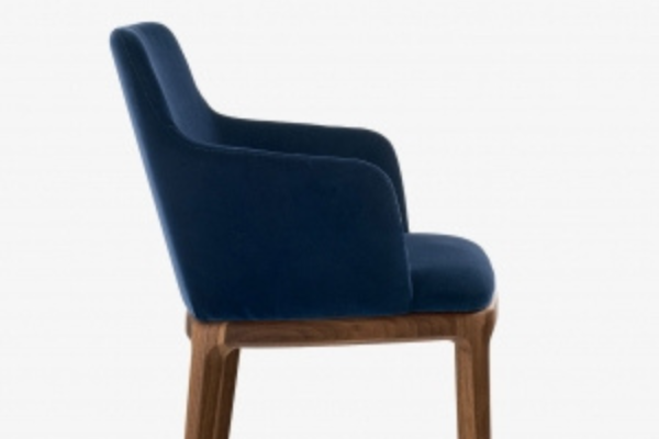 Eleganter Stuhl mit Beinen aus Massivholz, Sitz und Rückenlehne aus Polyurethanschaum. Version mit Armlehnen und Leder- oder Stoffbezug. Die Rückseite des Bezugs kann glatt oder mit Rautennähten sein. STANDARD VERSION: BEZUG GLATT