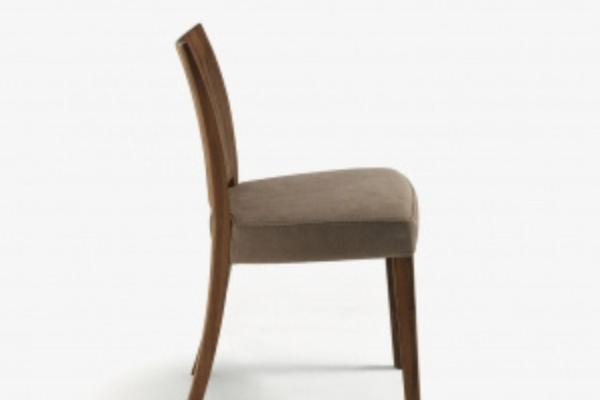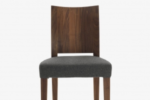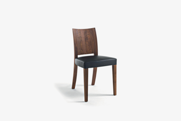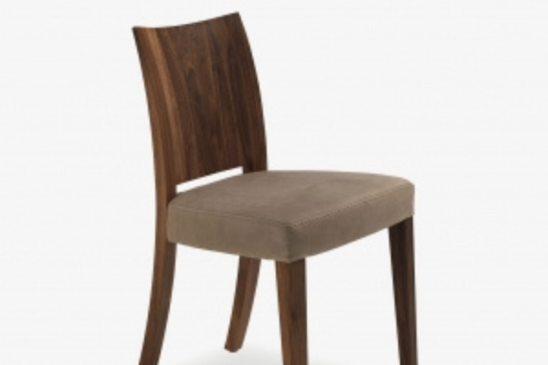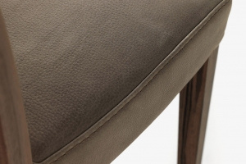 Stuhl aus Massivholz und Sitzpolster mit Leder oder Stoff bezogen.