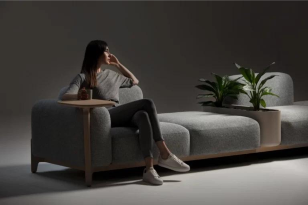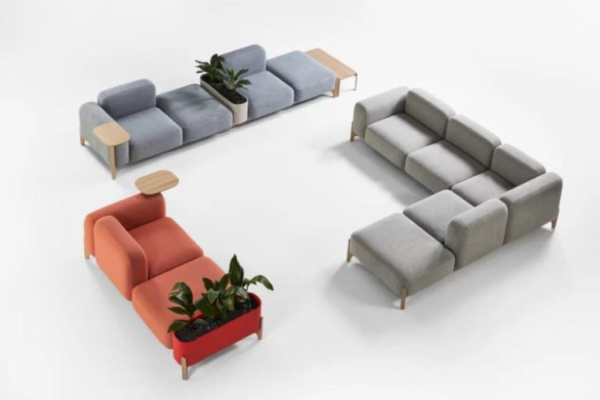 Sabot ist eine spielerische Anordnung abstrakter Volumina, getragen von charaktervollen Holzbeinen, die Holzbearbeitungsfähigkeit von Prostoria zelebrieren. Das modulare Sofasystem hat seinen Namen von einer Art einfacher Holzschuhe – eine Anspielung auf diese Holzbeine. Die weiche und zugängliche Designsprache ist von Wohnräumen inspiriert und verleiht Geschäftsräumen eine starke spielerische Identität. Jedes Modul hat eine superweiche, freundliche Silhouette, die wie eine Wolke über den freiliegenden Holzbeinen schwebt. Die Module können kombiniert werden, um lineare oder Inselkonfigurationen zu schaffen. Das bewegliche Seitenzubehör – einschließlich Tische und Trennelemente – ahmt die schwebende Sprache dieser Sitzmodule nach, während Pflanzgefäße die Möglichkeit bieten, grüne Sichtschutzwände zu schaffen. Sabot kann konfiguriert werden, um lineare 2-, 3- oder 4-Sitzer-Sofas sowie asymmetrische S-förmige Konfigurationen zu schaffen, die zusätzliche Privatsphäre zwischen den Sitzplätzen ermöglichen. Die Module können auch zu Inseln oder Clustern miteinander angeordnet werden. Diese flexiblen Konfigurationen aus niedrigen Tischplatten, Hockern und Sitzmodulen bieten Sitzgelegenheiten mit gemischter Kapazität für dynamische Räume wie Breakout-Zonen, Lobbys und Rezeptionen.