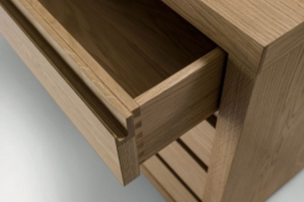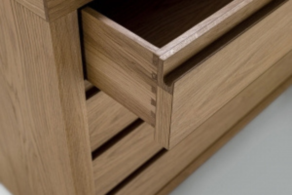 Kommode aus Tischlerplatte und Massivholz, mit 4 Schubladen mit traditioneller Schwalbenschanzverbindung gefertigt.