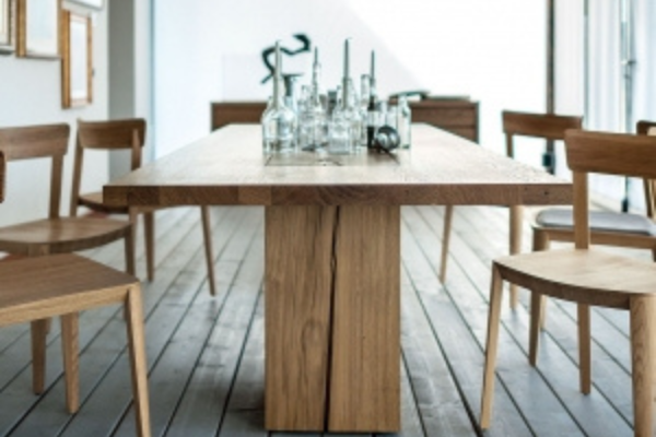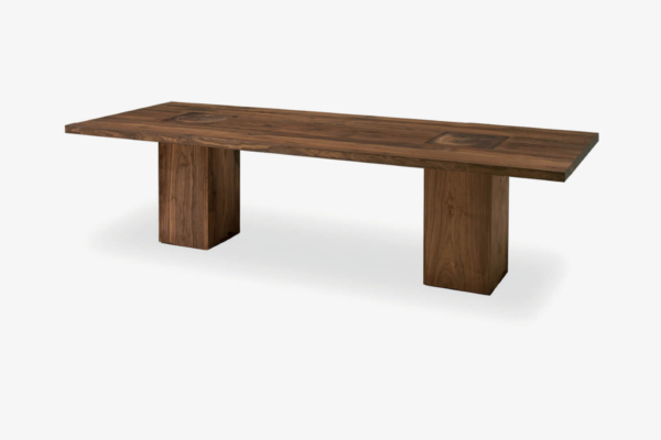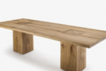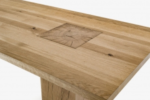 Tisch mit Platte bestehend aus verleimten Massivholzleisten und Beine aus Massivholzblöcken durch die Platte durchstossend. Variante mit rechteckiger Platte und zwei Beinen.