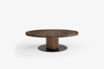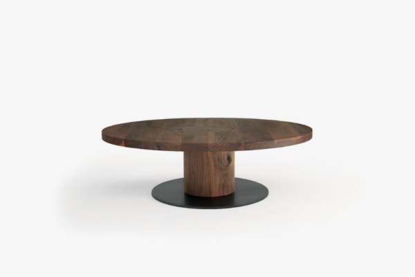 Runder Couchtisch völlig aus Massivholz; Bein in einem Massivholzblock durch die Platte durchstossend und Bodenplatte aus Eisen.