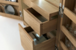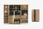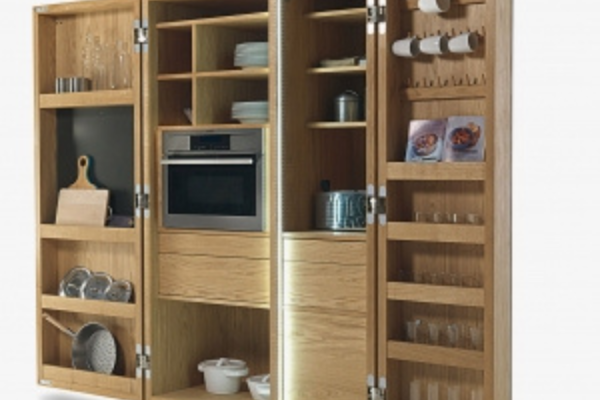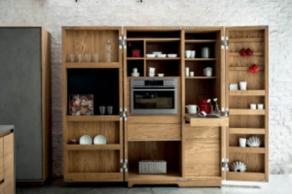 Mehrzweckschrank aus Massiv- und Furnierschichtholz, mit zwei um 180 Grad drehbaren Türen versehen. Innen ist der Schrank in Fächern verschiedener Größe unterteilt. Es besteht die Möglichkeit, in der Version Jumbo, kleine Geräte einzubauen. Die Regale an der Inneseite der Türen sind dafür gedacht, um Gläser; Geschirr und Sonstiges zu verstauen. In der Schrank-Mittelseitenwand sind Led-Lichtleisten montiert und dank eines Sensors geht das Licht beim Öffnen der Türen automatisch an.