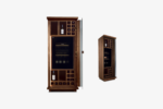 Mehrzweckschrank aus Massiv- und Furnierschichtholz, mit zwei um 180 Grad drehbaren Türen aus Rauchglas mit Holzgriffen versehen. Innen ist der Schrank funktionsgemäß unterteilt und ausgestattet. Es besteht die Möglichkeit, in der Version Jumbo, kleine Geräte einzubauen. In der Schrank-Mittelseitenwand sind Led-Lichtleisten montiert und dank eines Sensors geht das Licht beim Öffnen der Türen automatisch an.
