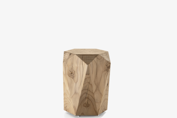 Hocker aus einem einzigen massiven Block duftendes Zedernholzes gewonnen, mit sechseckiger Basis und einer Symmetrie von Facetten wie bei einem Edelstein.