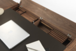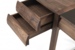 Schreibtisch mit geometrischem Design aus furnierter Tischlerplatte. Schubladen mit traditioneller Schwalbenschwanzverbindung. Kufengestell aus Massivholz. In zwei Varianten erhältlich.