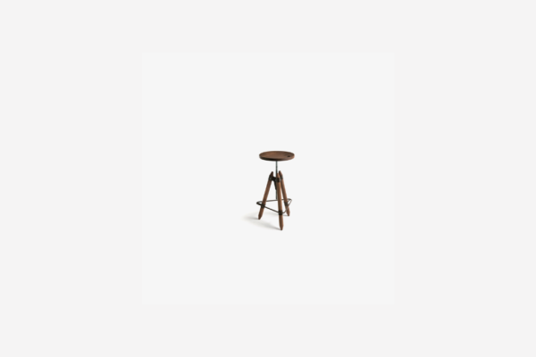 Barhocker mit Fußstützen aus Eisen, vollständig aus Massivholz erstellt, mit drehbarer und in der Höhe verstellbarer Sitzfläche