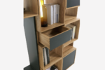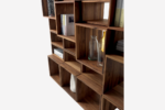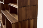 Bücherregal aus Massivholz mit unabhängigen Modulen, die gestapelt und nebeneinander mittels Sonderbeschläge gestellt werden. Elemente mit Schwalbenschwanzverbindung. Auf Anfrage können Rückwände, Türen und Schubladen mit Push-Pull System eingefügt werden. Tv-Element mit drehbarer oder festiger Rückwand und Kabelführung erhältlich. Das Bücherregal kann auch als Raumteiler mit zweiseitigen Elementen dienen.