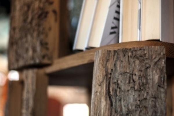 Bücherregal aus Briccola Massivholz; die Regalböden sind aus Eiche. Schlichte Säuleform mit verschiedenen Regalbrettern, um nützliche offene Fächer zu erschaffen. Aussen sind Briccola-Stücke mit belassenen Baumrinden.