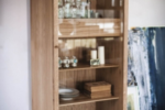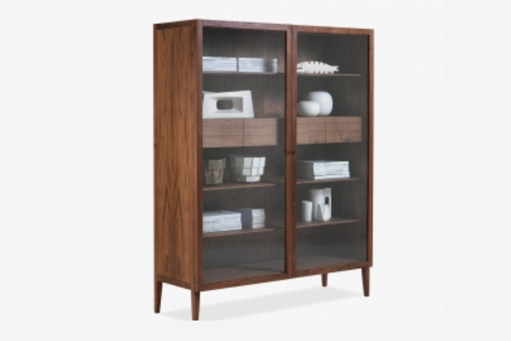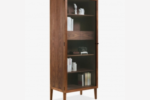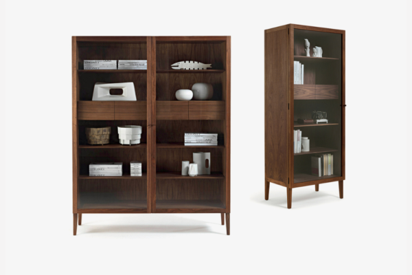 Vitrine mit Korpus aus Massiv- und Furnierschichtholz und Klarglastüren mit Holzknöpfen, verfügt über Innenschubladen mit Schwalbenschwanzverbindungen und steht auf dünnen Holzfüßchen. In zwei Versionen verfügbar: mit einer Tür oder mit zwei Türen.