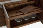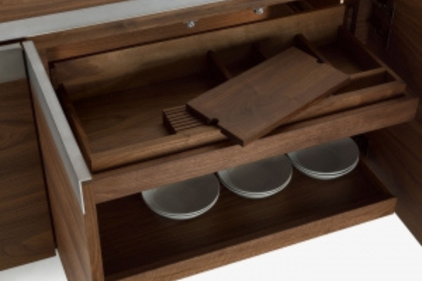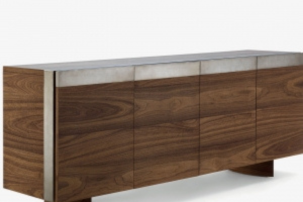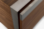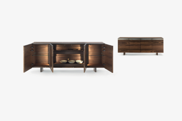 Kommode aus Massiv-und Furnierschichtholz, mit Drehtüren und innenliegenden ausziehbaren Tablaren. Eine Einfräsung längs in der Abdeckplatte dient als Griff für die Türen und schafft ein originales Öffnungssystem. Oben, entlang der ganzen Länge der Möbelfront und der Abdeckplatte verläuft eine dekorative Metallblende. Das Möbel steht auf zwei Holz-Fußwangen. In den Seitenwänden sind Led-Lichtleisten montiert und dank eines Sensors geht das Licht beim Öffnen der Türen automatisch an.