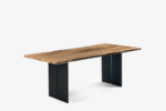 Tisch mit Platte aus Brettern in Briccola, nicht verleimt, mit Naturkanten. Gestell bestehend aus zwei Eisenwangen mit Mittelspalt.