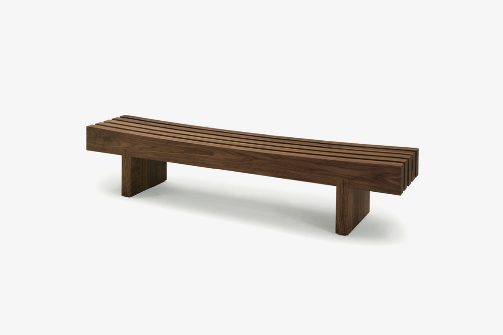 Bank völlig aus Massivholz. Ergonomische Sitzfläche aus Leisten, nicht verleimt. Die Beine sind mittels Holzdübeln montiert