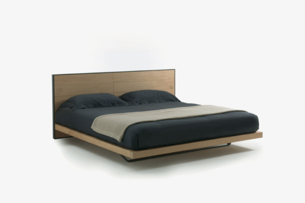 Bett aus furnierter Tischlerplatte Kopfteilrahmen aus Eisen und Bettrahmen aus Massivholz.
