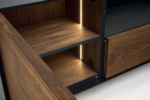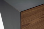 Sideboard aus Massiv- und Furnierschichtholz, mit Außenrahmen wahlweise aus Holz oder Metall erhältlich. Dies Sideboard verfügt über ein offenes Fach, Drehtüren und Schubladen mit Schwalbenschwanzverbindungen. Der Möbelkorpus steht auf dünnen Eisen-Fußwangen. Die seitlichen Fächer sind mittels eingelassener LED-Lichtleisten beleuchtet und dank eines Sensors geht das Licht beim Öffnen der Türen automatisch an. Anders wird das Lich im offenen Fach durch einen Berührsensor ein- und ausgeschaltet.
