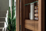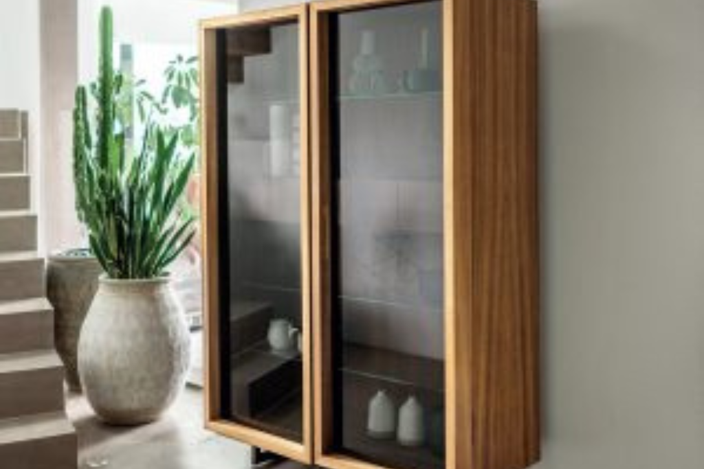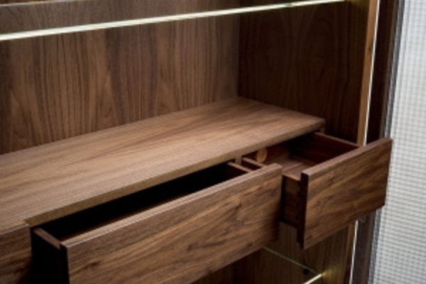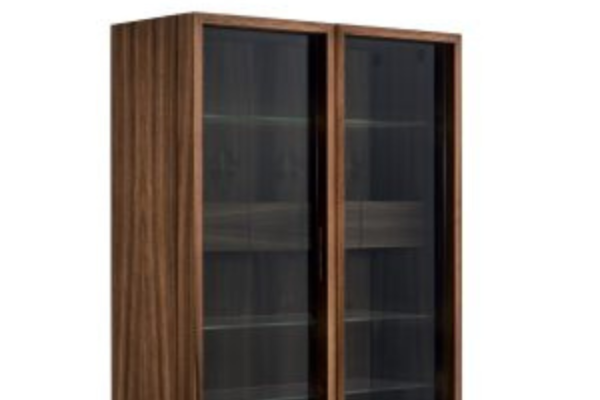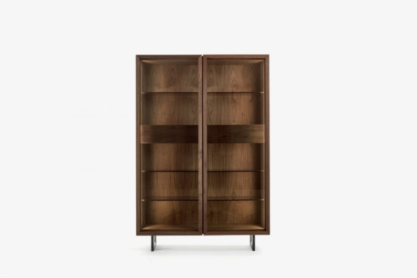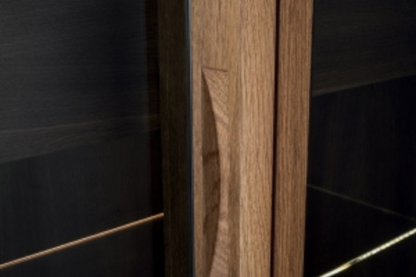 Mehrzweckschrank aus Furnierschichtholz, mit um 180 Grad drehbaren Glastüren und Türrahmen aus Holz versehen. Der Schrankkorpus steht auf Fuß-Kufen aus Eisen. Der Innenraum ist mittels in der Schrank-Seitenwänden eingelassener LED-Lichtleisten beleuchtet und das Licht wird durch einen Berührsensor in der Außenseitenwand ein- und ausgeschaltet.