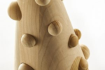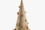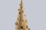 Der traditionelle Weihnachtsbaum wird durch eine einfache, kegelförmige Form interpretiert, die durch mehrere runden Löcher unterbrochen wird, in denen kleine Massivholzkugeln Platz finden, die an dekorative Kugeln erinnern.