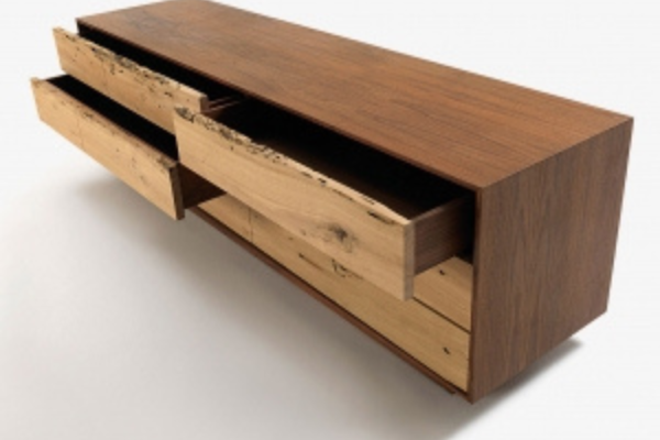 Schubkastenkommode aus Massiv- und Furnierschichtholz, mit Außenrahmen wahlweise aus Holz oder Metall erhältlich. Die Kommode verfügt über Schubladen mit Schwalbenschwanzverbindungen.