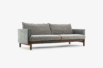 Sofa mit linearem Gestell aus Massivholz; Kissen, Armlehne und Rückenlehne aus Leder oder Stoff bezogen. In verschiedenen Maßen erhältlich. IM FOTO: NUSSBAUM (A1) + STRUKTUR IN LEDER NABUK (D4) + SITZ-UND RÜCKENKISSEN IN STOFF MAPLE (D2)