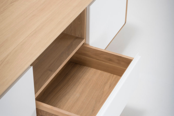 Die Kommode Ena 135 cm /180cm ist mit ihrem stilvollen skandinavischen Design, eine Schönheit in der Innenaussstattung. Der hochwertigen Korpus ist aus massiver Eiche.. Auf dem Korpus befinden sich vier mit Soft-Close-Funktion und zwei Türen, die sich in zwei Regale auf jeder Seite öffnen. Das Massivholzgestell ist in zwei Farben erhältlich – weiß oder naturgeölt. Produktfotos haben eine weiße Fläche. Schauen Sie sich auch andere Kommoden und Schränke aus der Ena-Serie an.